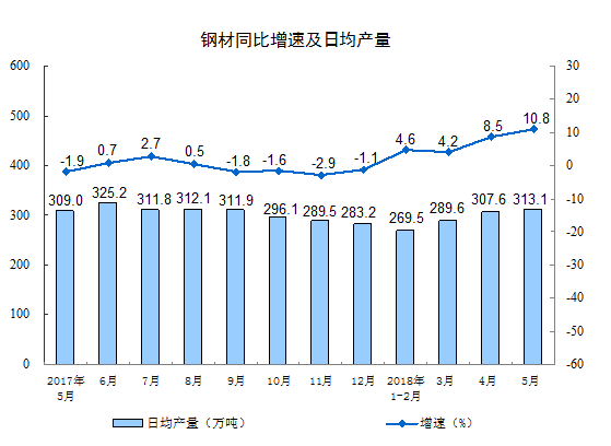 分產(chǎn)品看,5月份,596種產(chǎn)品中有368種產(chǎn)品同比增長。其中,鋼材9707萬噸,同比增長10.8%;水泥21521萬噸,增長1.9%;十種有色金屬455萬噸,增長4.3%;乙烯141萬噸,下降4.5%;汽車238.8萬輛,增長9.5%;轎車103.9萬輛,增長20.5%;發(fā)電量5443億千瓦時,增長9.8%;原油加工量5066萬噸,增長8.2%。