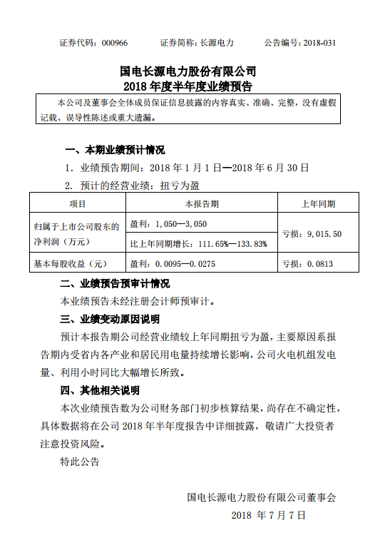 近日,原國(guó)電集團(tuán)下屬電力上市公司長(zhǎng)源電力發(fā)布了2018年度半年度業(yè)績(jī)預(yù)告,預(yù)計(jì)本報(bào)告期公司經(jīng)營(yíng)業(yè)績(jī)較上年同期扭虧為盈,主要原因系報(bào)告期內(nèi)受省內(nèi)各產(chǎn)業(yè)和居民用電量持續(xù)增長(zhǎng)影響,公司火電機(jī)組發(fā)電量、利用小時(shí)同比大幅增長(zhǎng)所致。