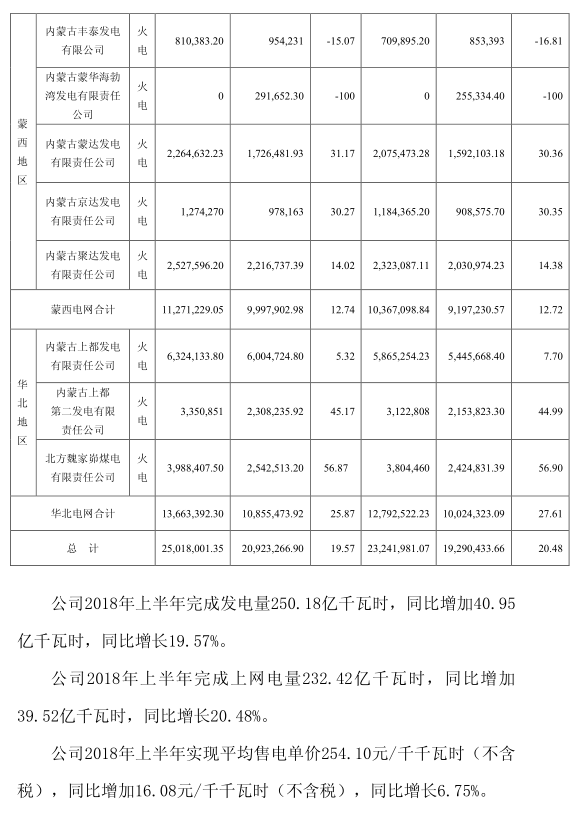 近日,華能集團旗下上市公司內(nèi)蒙華電發(fā)布了2018年上半年經(jīng)營性信息有關(guān)情況公告。內(nèi)蒙華電2018年上半年完成發(fā)電量250 18億千瓦時,同比增加