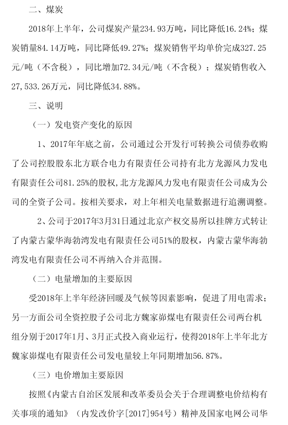 受2018年上半年經(jīng)濟回暖及氣候等因素影響,促進了用電需求;另一方面公司全資控股子公司北方魏家峁煤電有限責任公司兩臺機組分別于2017年1月、3月正式投入商業(yè)運行,使得2018年上半年北方魏家峁煤電有限責任公司發(fā)電量較上年同期增加56.87%。