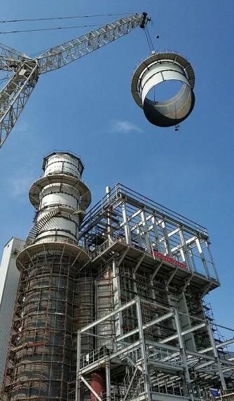 7月15日,周口燃?xì)怆姀S工程項(xiàng)目2號余熱鍋爐鋼煙囪最后一個組件順利吊裝就位,標(biāo)志著余熱鍋爐鋼煙囪組件吊裝作業(yè)全部完成。