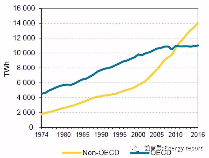 2016年,非經(jīng)合組織國家發(fā)電量在世界發(fā)電量中的占比達(dá)到了56.2%,這是1974年占比(28.0%)的2倍,反映了2000年以來非經(jīng)合組織區(qū)域發(fā)電量平均增長率較高。1974~2000年,非經(jīng)合組織國家的發(fā)電量以年均4.6%的速度增長,而經(jīng)合組織國家的發(fā)電量年均增長率則為3.0%。然而,自從本世紀(jì)初起,經(jīng)合組織國家和非經(jīng)合組織國家發(fā)電量增長率出現(xiàn)了“分歧”,2000~2010年,經(jīng)合組織國家發(fā)電量年均增長率為1.1%,而非經(jīng)合組織國家同期的發(fā)電量年均增長率則為6.4%;2010~2016年,經(jīng)合組織國家發(fā)電量年均增長率為降至僅0.1%,而非經(jīng)合組織國家同期的發(fā)電量年均增長率則為4.8%。2011年,非經(jīng)合組織發(fā)電量首次超過經(jīng)合組織,自那以后,非經(jīng)合組織發(fā)電量占比繼續(xù)增長。