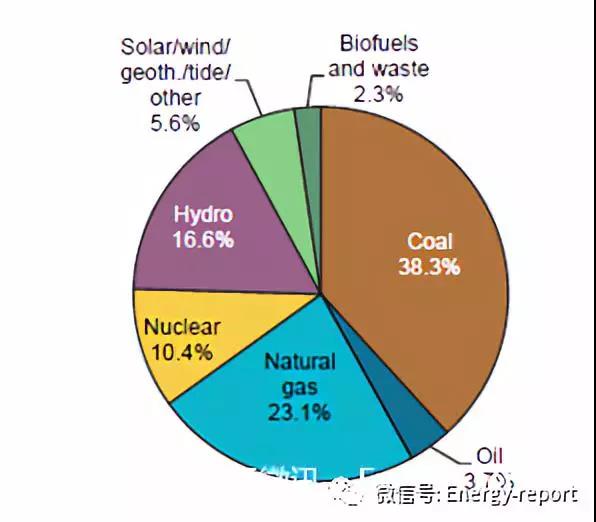 2016年,來自可燃燃料的發(fā)電量占世界總發(fā)電量的67.3%(其中:65.1%來自化石燃料;2.3%來自生物燃料、廢棄物等),水電(包括抽水蓄能)提供了發(fā)電量的16.6%;核電發(fā)電量占比為10.4%;地?zé)帷⑻柲?、風(fēng)能、潮汐等能源發(fā)電占比為5.6%;而生物燃料和廢棄物等發(fā)電量占比為剩余的2.3%。