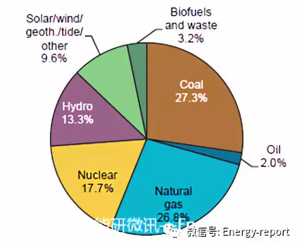 2017年,來自可燃燃料的發(fā)電量在經(jīng)合組織總發(fā)電量中的占比為59.4%(其中:56.1%來自化石燃料;3.2%來自生物燃料和廢棄物);核電發(fā)電量占比17.7%;水電發(fā)電量占比13.3%;地?zé)帷⑻柲?、風(fēng)能、潮汐等發(fā)電量占比9.6%。