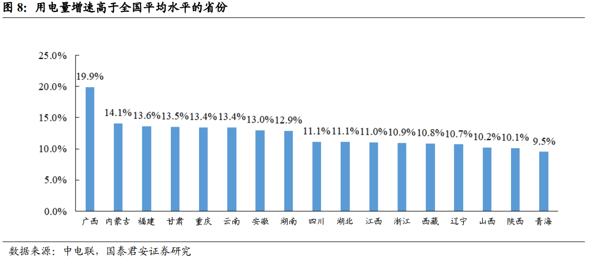 各省 1-6 月全國(guó)各省份全社會(huì)用電量均實(shí)現(xiàn)正增長(zhǎng)。其中,全社會(huì)用電量增速高于全國(guó)平均水平(9.4%)的省份有 17 個(gè)。