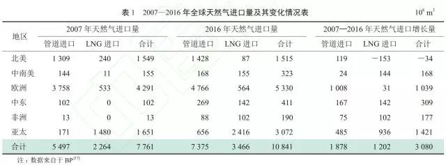 據(jù)BP的數(shù)據(jù),北美、亞太和歐洲是全球天然氣貿(mào)易的3個中心,其中北美和歐洲天然氣進口量基本穩(wěn)定,而亞太則是全球天然氣貿(mào)易量增長的主要地區(qū)。2007—2016年,全球天然氣貿(mào)易量由0.7761×10^12m^3增長至1.0841×10^12m^3,增長了39.7%。其中,管道氣由5497×10^8m^3增長至7375×10^8m^3,增長了34.2%;LNG由2264×10^8m^3增長至3466×10^8m^3,增長了53.1%(表1)。預計2017年全球管道氣貿(mào)易量約為7630×10^8m^3,比上年增長3.5%;LNG貿(mào)易量為3900×10^8m^3,比上年增長12.5%。