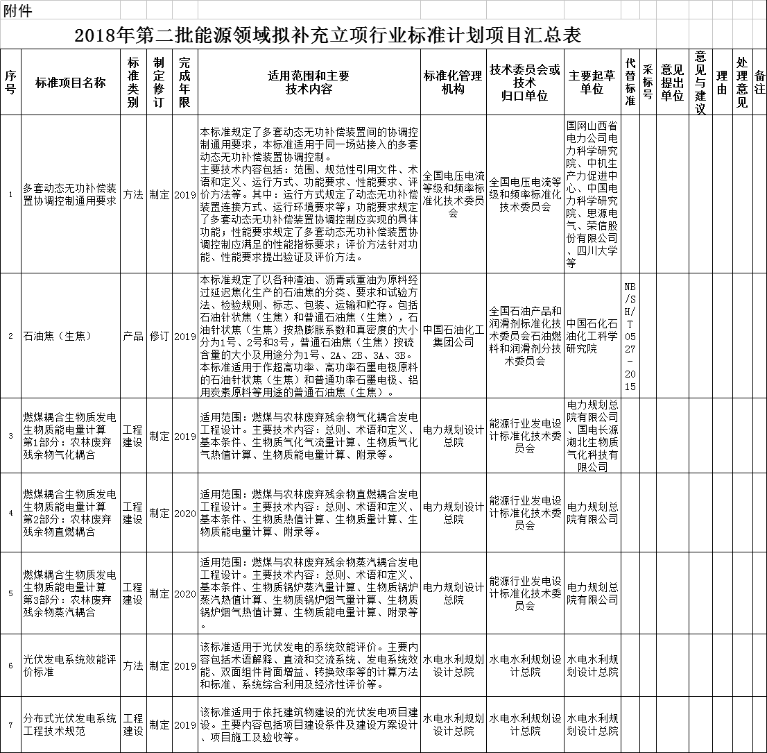 能源局:對2018年第二批能源領(lǐng)域擬補充立項的行業(yè)標準計劃征求意見(附生物質(zhì)發(fā)電、光伏發(fā)電項目表)