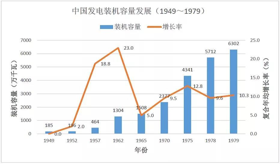 接下來看中國的電力裝機發(fā)展。按照電力界比較普遍的說法,建國后我國電力工業(yè)的發(fā)展可以劃分為三個階段:第一階段為1949-1978 年,嚴格的計劃經(jīng)濟控制時期,電力工業(yè)垂直壟斷。這一階段作為新中國電力發(fā)展的初期階段,起點基數(shù)低,但增速并不慢,年均復合增長率達到了年均12.5%,從1949年的185萬千瓦,發(fā)展到1978年的5712萬千瓦。第二階段為1979-2002 年,允許外資、民間資本進入,電價管制有所松動,電力裝機呈現(xiàn)7.8%的復合增長率,從1979年的6300萬千瓦,發(fā)展到2002年的3.56億千瓦。第三階段為2003-2016年,2002年開始電力體制改革,廠網(wǎng)分離,以五大發(fā)電集團為代表的發(fā)電側競爭,電力裝機復合增速提升至11.7%,從2003年的3.9億千瓦發(fā)展到2016年的16.5億千瓦。2016年以來,新一輪電改啟動,未來的發(fā)展如何,拭目以待。下面分三張圖分別展示三個階段的發(fā)展。
