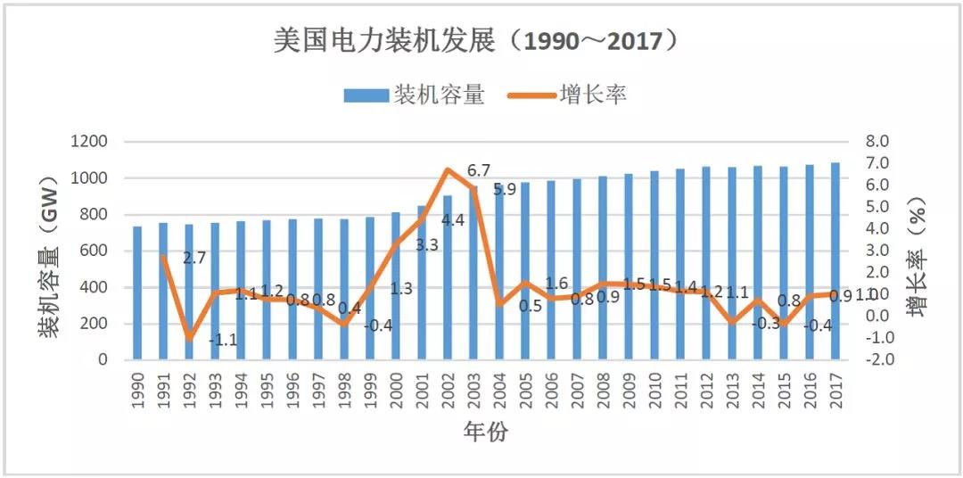 我們可以看到,美國的發(fā)電裝機到1990年已經(jīng)發(fā)展到了很穩(wěn)定的階段。除了2002~2003年這4年發(fā)展較快之外(2002年增長6.7%為最增長率),其余年份,基本處于穩(wěn)定狀態(tài),自2008年突破10億千瓦,截至2017年(10.85億)仍未能突破11億千瓦。