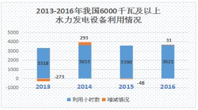 2016年,我國6000千瓦及以上水力發(fā)電設(shè)備平均利用小時數(shù)為3621小時,同比增加31小時。雖然扭轉(zhuǎn)2015年下滑趨勢,但增長乏力。