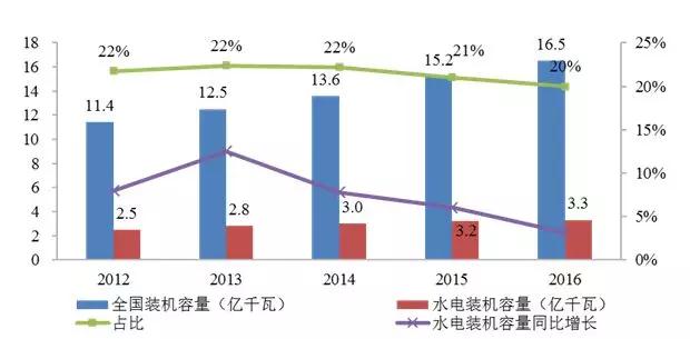 2016年底國(guó)家能源局公布《水電發(fā)展“十三五”規(guī)劃(2016-2020年)》,規(guī)劃顯示,2020年我國(guó)水電總裝機(jī)容量達(dá)到3.8億千瓦,其中常規(guī)水電3.4億千瓦,抽水蓄能4000萬(wàn)千瓦,年發(fā)電量1.25萬(wàn)億千瓦時(shí),折合標(biāo)煤約3.75億噸,在非化石能源消費(fèi)中的比重保持在50%以上。預(yù)計(jì)2025年全國(guó)水電裝機(jī)容量達(dá)到4.7億千瓦,其中常規(guī)水電3.8億千瓦,抽水蓄能約9000萬(wàn)千瓦;年發(fā)電量1.4萬(wàn)億千瓦時(shí)。