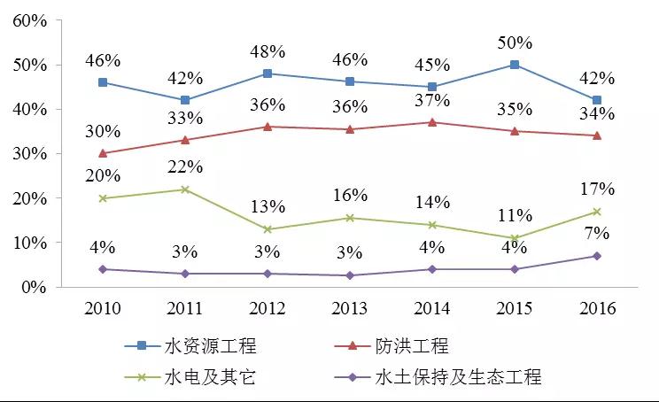 按投資用途分析,水資源工程和防洪工程是水利建設(shè)的重點(diǎn)項(xiàng)目工程,從近七年分用途完成投資額的占比情況來(lái)看,水資源工程基本占據(jù)所有投資的一半。2016年水資源工程和防洪工程投資占比有所下降,水電和水土保持及生態(tài)工程投資有所增加。
