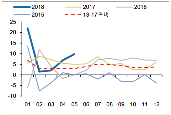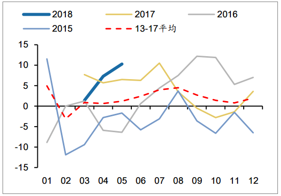 2018年1-5月,全國火電發(fā)電量同比增長8.1%(13-17年間平均增速為1.4%),增速較去年 同期增長0.9個(gè)百分點(diǎn)。5月當(dāng)月發(fā)電量同比增長10.3%(13-17年間平均增速為1.2%), 增速較去年同期增長3.8個(gè)百分點(diǎn)。