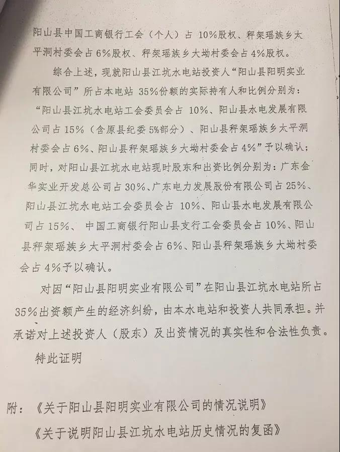 根據(jù)陽(yáng)山縣江坑水電站股東會(huì)議于1994年12月1日通過(guò)的水電站章程及銀行付款憑證,廣東金華實(shí)業(yè)開(kāi)發(fā)總公司投入江坑水電站的初始資金為600萬(wàn)元,根據(jù)陽(yáng)山縣江坑水電站董事會(huì)決議,1996年分紅擴(kuò)股85.10萬(wàn)元,2014年和2015年投入增效擴(kuò)容資金206.459158萬(wàn)元。廣東金華實(shí)業(yè)開(kāi)發(fā)總公司投資陽(yáng)山江坑水電站金額共計(jì)8,915,591.58元,股比份額30%。