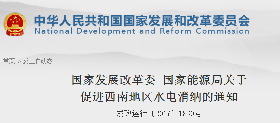 國家發(fā)展改革委、國家能源局發(fā)布關于促進西南地區(qū)水電消納的通知【發(fā)改運行〔2017〕1830號】,原文如下: