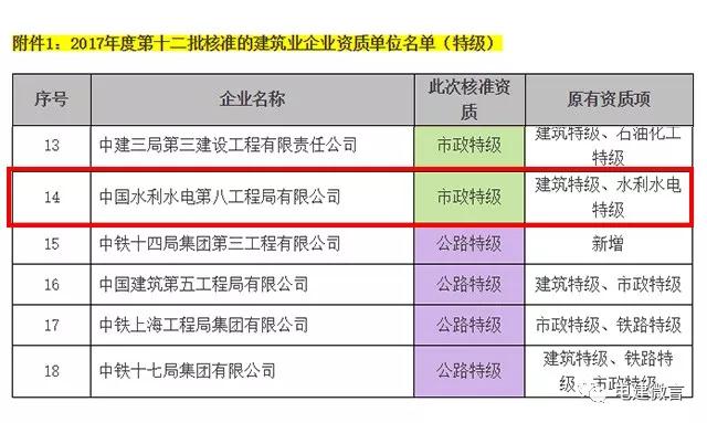 2002年6月經(jīng)國家住建部審查批準(zhǔn),水電八局成功獲得水利水電工程施工總承包特級資質(zhì),成為中國首批特級資質(zhì)企業(yè)。