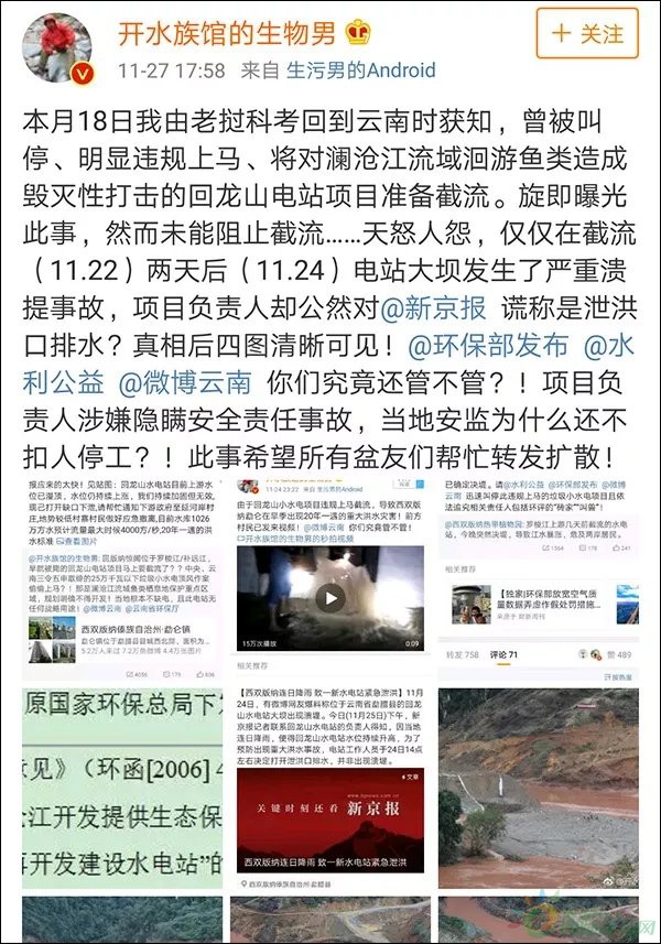 ▲某知名魚類學(xué)家微博質(zhì)疑回龍山水電站。