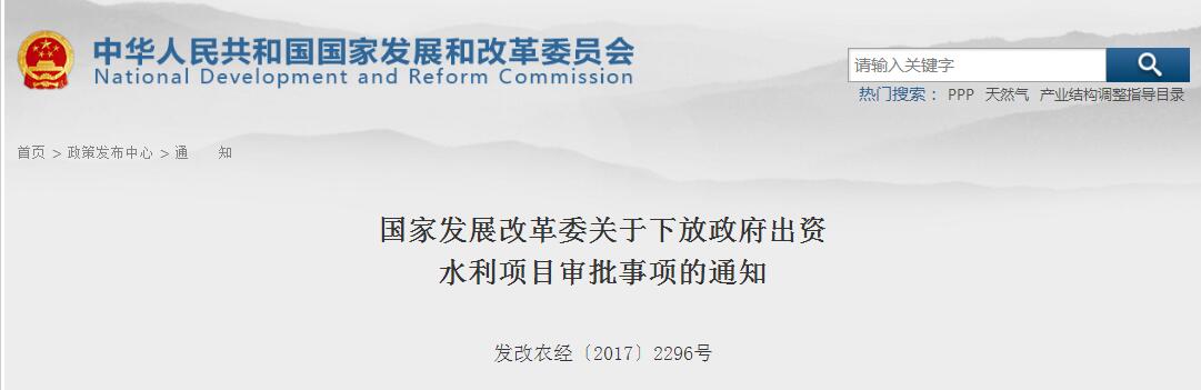 發(fā)改委發(fā)布《國家發(fā)展改革委關(guān)于下放政府出資水利項(xiàng)目審批事項(xiàng)的通知》,為深入推進(jìn)“放管服”改革,經(jīng)報(bào)國務(wù)院同意,對政府出資的地方水利項(xiàng)目,在2015年精簡項(xiàng)目審批程序的基礎(chǔ)上,再下放部分項(xiàng)目審批權(quán)限,同時(shí)加強(qiáng)規(guī)劃管理和事中事后監(jiān)管,放管結(jié)合,優(yōu)化服務(wù),對審批權(quán)限和責(zé)任做出了明確的規(guī)范。