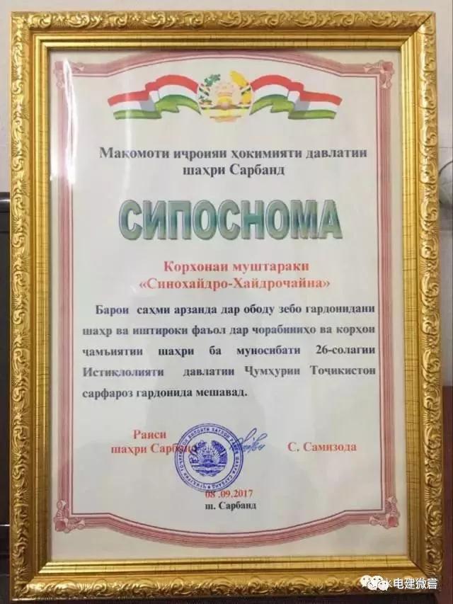 2017年9月,項(xiàng)目部榮獲塔吉克斯坦民族獨(dú)立貢獻(xiàn)先進(jìn)單位榮譽(yù)證書(shū)。