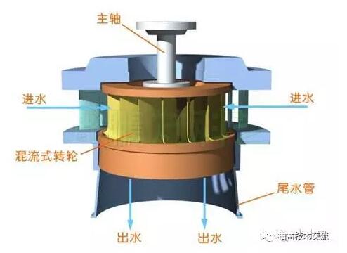 混流式水輪機的水流從水輪機四周水平方向向中心流入轉(zhuǎn)輪(徑向進入),然后轉(zhuǎn)為向下方向出口,水流進入轉(zhuǎn)輪內(nèi)在向軸芯方向通過葉片時推動轉(zhuǎn)輪,同時在向下通過葉片時也推動轉(zhuǎn)輪。也就是說水流在徑向與軸向通過葉片時都做功,故稱為混流式水輪機,也稱為幅向軸流式水輪機。