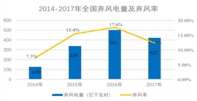 公開數(shù)據(jù)顯示,2017年全國(guó)棄風(fēng)電量合計(jì)約422億千瓦時(shí),同比降低75億千瓦時(shí)。全國(guó)平均棄風(fēng)率約12.3%,同比下降5.2個(gè)百分點(diǎn)。這是三年內(nèi)棄風(fēng)電量和棄風(fēng)率第一次實(shí)現(xiàn)“雙降”。