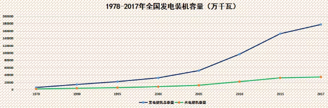 1978年我國水電裝機容量僅為1728萬千瓦,截至2017年底,我國水電裝機容量已經(jīng)達到34395萬千瓦。40年間,我國水電裝機容量增長近20倍。