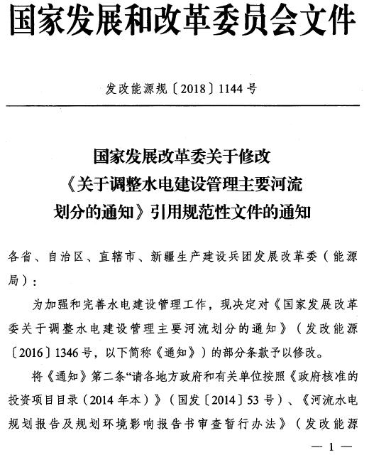 日前,發(fā)改委發(fā)布關(guān)于修改《關(guān)于調(diào)整水電建設(shè)管理主要河流劃分的通知》引用規(guī)范性文件的通知。原文如下: