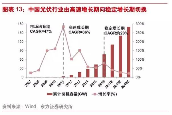 特別是2012年光伏產(chǎn)業(yè)遭受歐美“雙反”沖擊,國家出臺光伏的標桿電價制度,下游裝機容量迅速爆發(fā),行業(yè)進入高速發(fā)展期,從2011-2016年,國內(nèi)累計光伏裝機容量增長了85倍。