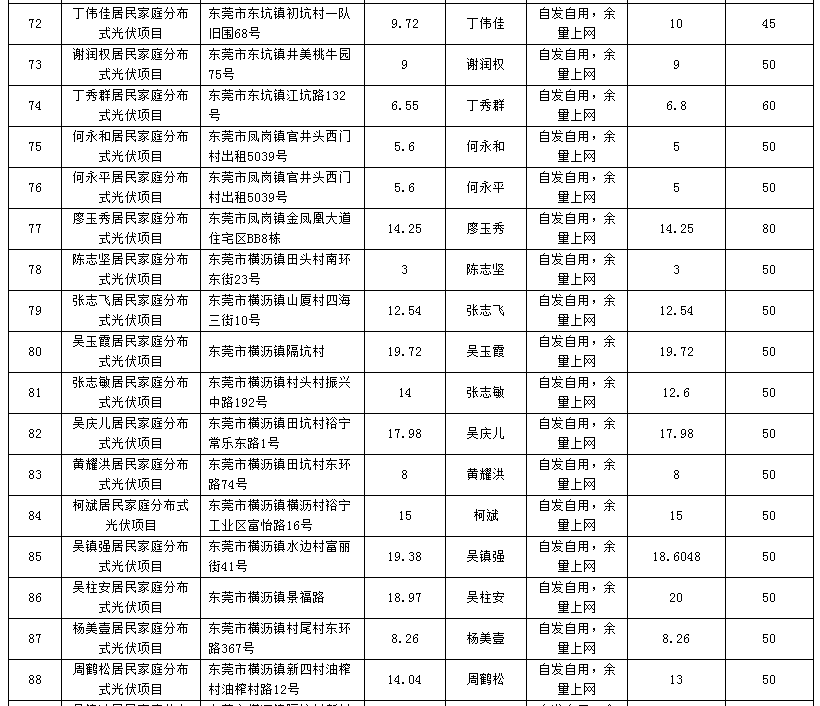 廣東東莞224個(gè)家庭分布式光伏項(xiàng)目備案信息表