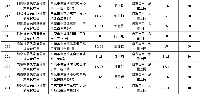 廣東東莞224個家庭分布式光伏項目備案信息表