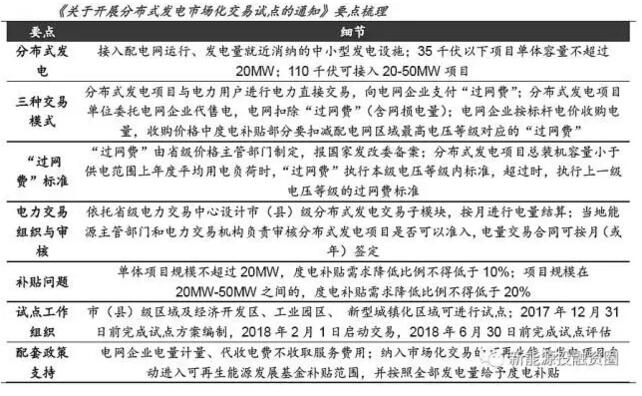 分布式發(fā)電市場化交易試點于2018年2月1日實行。試點地區(qū)選擇電力需求量較大、電網(wǎng)接入條件較好,可達(dá)到較大總量規(guī)模的市縣級區(qū)域以及經(jīng)濟開發(fā)區(qū)、工業(yè)園區(qū)、新型城鎮(zhèn)化區(qū)域。2017年12月31日前,有關(guān)試點地區(qū)完成試點方案編制,進(jìn)行交易平臺建設(shè)準(zhǔn)備。2018年1月31日前,試點地區(qū)完成分布式發(fā)電交易平臺建設(shè)、制定交易規(guī)則等相關(guān)工作,自2018年2月1日起啟動交易。2018年6月30日前,對試點工作進(jìn)行總結(jié)評估,完善有關(guān)機制體系,視情況確定推廣范圍和時間。