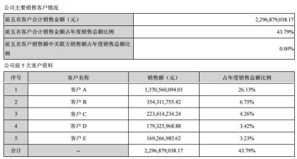 2016年,第一大客戶A貢獻(xiàn)13.71億元,占比26.13%;前五大合計(jì)金額22.97億元,占比43.79%。