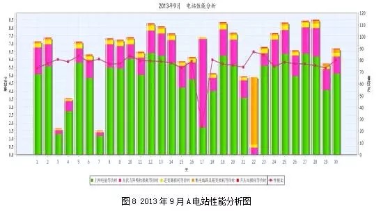 仍然以我國西北地區(qū)光伏電站A的生產(chǎn)運行數(shù)據(jù)為例,2013年度電站性能分析情況如圖7所示:
