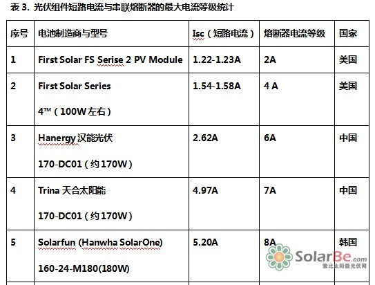 根據表3可知,由于光伏電池板制造工藝的不同,導致短路電流的差異性很大。所以在選擇過電流保護裝置時,由于熔斷器的電流等級具備以下額定電流等級: