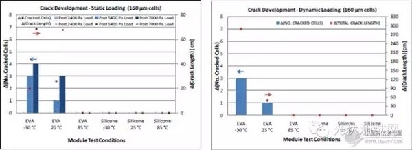 圖4:不同溫度下,EVA、有機(jī)硅封裝組件的機(jī)械載荷電池片隱裂及裂紋長(zhǎng)度測(cè)試