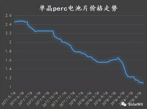 這張圖展示了Perc電池片最近一年的價格走勢,從2017年每瓦2.58元跌倒了現(xiàn)在的1.08元/瓦。高效電池片價格的悄然變化即將引發(fā)組件技術(shù)的新革命(當(dāng)然前提是能解決疊瓦的專利問題)