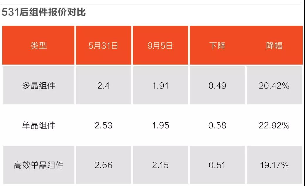 資深光伏行業(yè)研究員王淑娟對(duì)531后大量大型光伏項(xiàng)目的EPC中標(biāo)價(jià)格進(jìn)行統(tǒng)計(jì)后發(fā)現(xiàn),平均下降了1.1元/W,均價(jià)4.1元/W,降幅達(dá)到20%。同時(shí),531之后,各類(lèi)光伏組件的平均價(jià)格也下降了0.5~0.6元/W,平均降幅為20%左右。