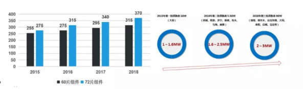 組件功率的提升帶動系統(tǒng)單元規(guī)模的持續(xù)增長。據(jù)統(tǒng)計(jì),第一批領(lǐng)跑者項(xiàng)目系統(tǒng)單元設(shè)計(jì)多以1-1.6MW規(guī)模為主,到第三批領(lǐng)跑者則提升至2-3MW單元規(guī)模,可以預(yù)見的是第四批領(lǐng)跑者發(fā)電單元至少3MW規(guī)模以上。組件功率的提升帶動系統(tǒng)單元的不斷擴(kuò)大,要想獲得更低的度電成本和更高的收益,逆變器的功率提升勢在必行。