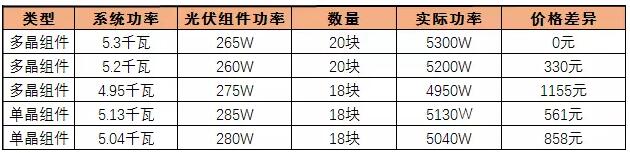 從兩個(gè)表格中可以看出,同樣號(hào)稱(chēng)5kW的發(fā)電系統(tǒng),由于光伏組件的功率差異,價(jià)格不但有區(qū)別,補(bǔ)貼收入一樣有影響。有的人說(shuō)了,單晶組件的發(fā)電量要比多晶組件的發(fā)電效率高。那么,同樣功率的多晶組件和單晶組件,單晶每天多發(fā)出來(lái)的電量也是非常有限的。兩項(xiàng)同時(shí)參考,價(jià)格差異也是輕松超過(guò)一千元。