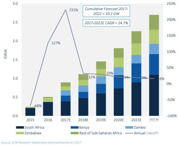 撒哈拉以南非洲對(duì)開發(fā)商展現(xiàn)了10吉瓦的機(jī)會(huì)。2016年,南非、津巴布韋、肯尼亞和納米比亞至少投運(yùn)了10個(gè)公共事業(yè)規(guī)模項(xiàng)目。展望未來,GTM預(yù)計(jì)2017年撒哈拉以南非洲將實(shí)現(xiàn)近1吉瓦的并網(wǎng)容量,并有可能到2022年新增太陽(yáng)能裝機(jī)量超10吉瓦。