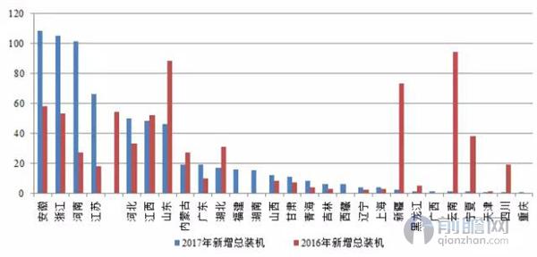 以下為2016年、2017年一季度各省市光伏新增總裝機量對比: