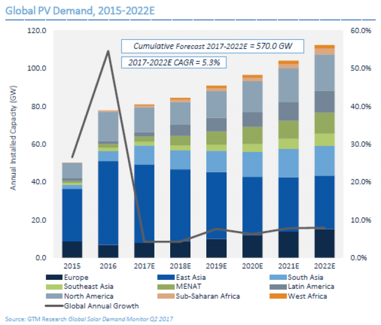 4月,GTM已預(yù)測2017年全球太陽能需求有望高達85吉瓦,但是在最新的報告中將上述數(shù)據(jù)下調(diào)至84.1吉瓦。