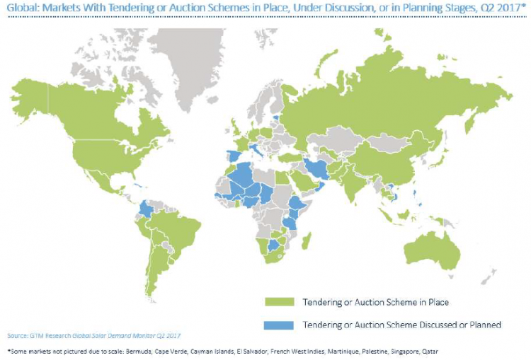 隨著更多國家采取拍賣機制來分配容量并降低關(guān)稅,而且通常不需要提供補貼,拍賣的數(shù)量預(yù)計繼續(xù)擴張。已經(jīng)有48個國家采取拍賣策略,另外有27個市場正考慮或計劃這樣的政策。