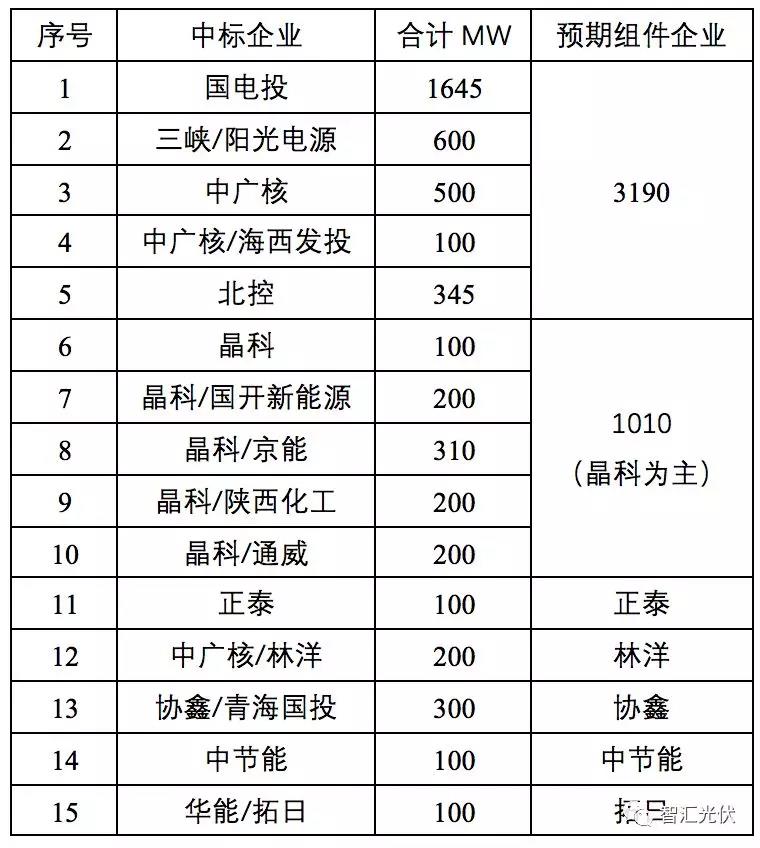 上表中,晶科中標1010MW的項目,但這些項目,應該以晶科的組件為主,也會有其他品牌的組件。如,7月28日,國開新能源就公開招標了300MW的310W組件,部分應該是用于領(lǐng)跑者項目的。中標情況如下: