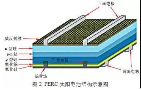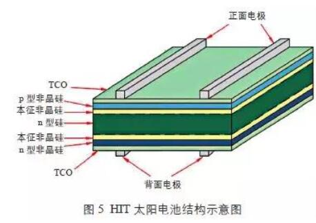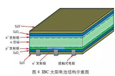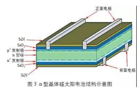 圖3為n型晶體硅太陽能電池結(jié)構(gòu)示意圖。n型晶體硅太陽能電池較p型晶體硅太陽電池具有少子壽命高、光致衰減小等優(yōu)點,有更大的效率提升空間。同時,n型晶體硅太陽能電池還具有弱光響應好、溫度系數(shù)低等優(yōu)點。