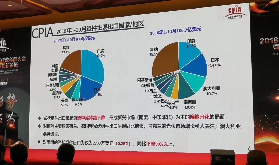 組件出口方向,集中度繼續(xù)了前幾年的趨勢,在逐漸降低。印度市場占3成,今年砍掉一半,日本也下降了10個百分點。很多新興市場也在發(fā)展當中。