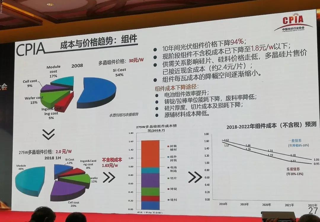 王勃華表示,產(chǎn)業(yè)發(fā)展的速度非???,2022年,組件成本可降低為1元/W。預計2022年仍會有30%左右的下降,主要表現(xiàn)在技術方面。