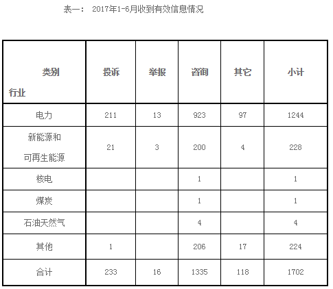 東北能監(jiān)局2017年1-6月份12398熱線受理處理情況通報