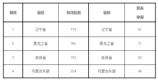 表二:2017年1-6月有效信息與各省投訴舉報排名情況