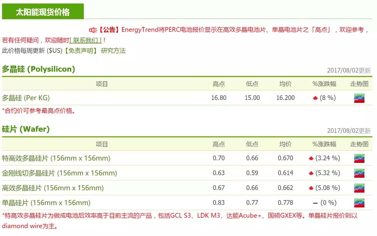 本周單晶組件進入價格保衛(wèi)戰(zhàn),單晶280W的成交價在RMB3-3.02/W,近期有可能受到多晶缺貨影響稍稍止跌。陸廠的多晶組件價格則受到國內(nèi)需求轉(zhuǎn)弱的影響,也開始有微幅的松動,成交主流在RMB2.83-2.87/W之間。而第三地組件則因為雙反壁壘以及201案致使有極佳的議價優(yōu)勢,價格仍維持在高段的US$0.38/W。